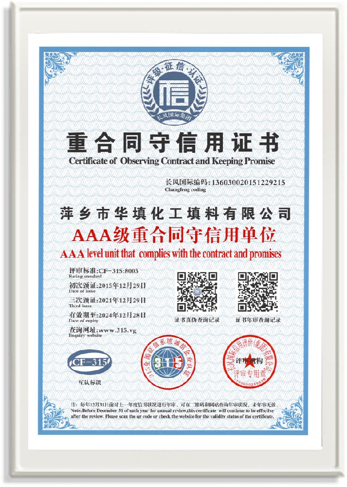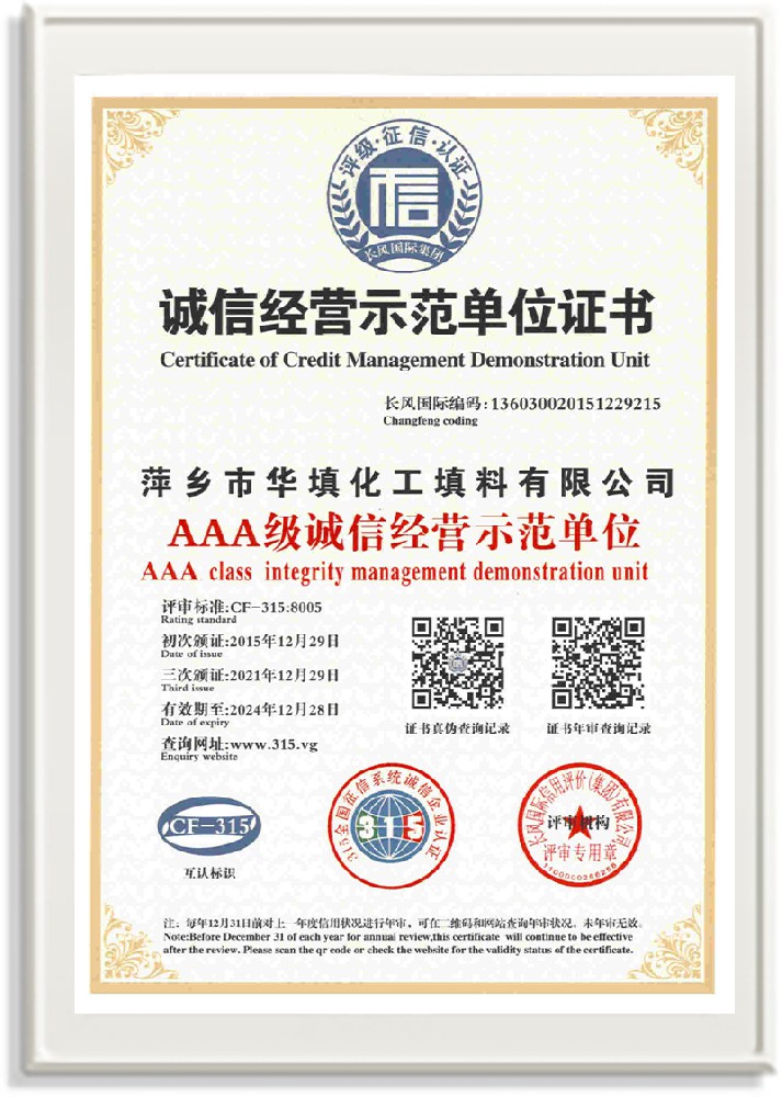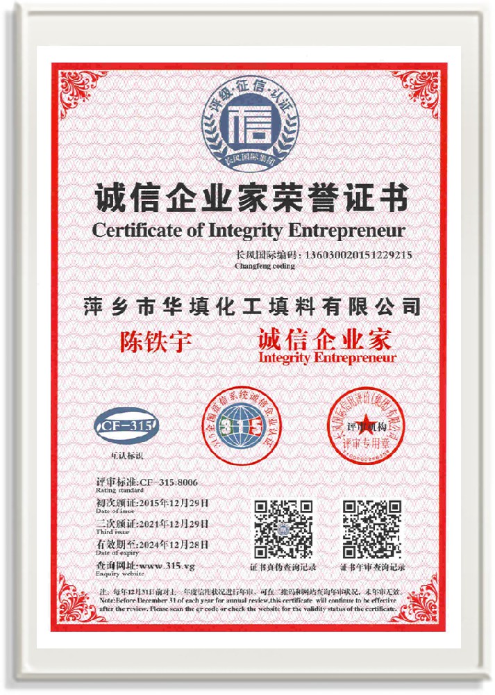 萍鄉市華填化工填料有限公司,位于320國道、109國道、浙贛鐵路、昌金高速公路貫穿其中,交通便利,是江西西部一顆燦爛明珠,創(chuàng)建于20世紀70年代初期,是中國石油天然氣股份有限公司“能源一號網”會員企業、中國石化物資采購電子商務網絡和中國海洋石油總公司采辦業務系統成員單位,是上海大學江西材料基因組工程產業研究院工業陶瓷產業創(chuàng)新聯盟基地,且通過ISO9001:2015質量管理體系、ISO14001:2015環(huán)境管理體系、ISO45001:2018職業健康安全管理體系認證的化工填料生產企業。公司擁有陶瓷、塑料、金屬填料、催化劑、活性氧化鋁、分子篩等產品生產線,現有固定資產3616萬元,占地面積3.8萬平方米。公司具有悠久的生產歷史、雄厚的技術力量和先進的生產工藝設備,可生產工業瓷球(支撐劑)、陶瓷、金屬、塑料質的規(guī)整、散堆化工填料及分子篩、催化劑、生化濾料、活性氧化鋁、石化助劑、活性炭、環(huán)保材料、耐火材料等系列的200多種規(guī)格型號產品。